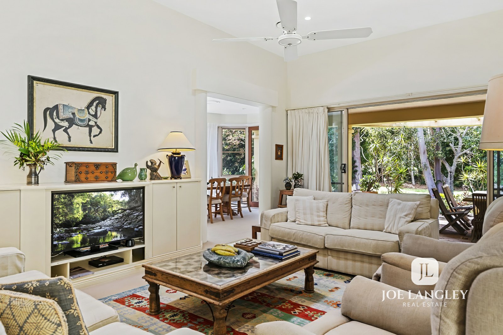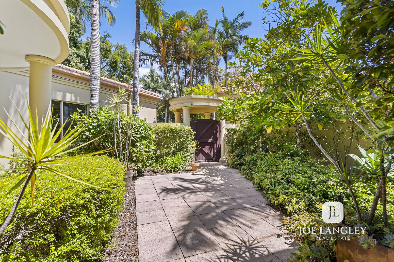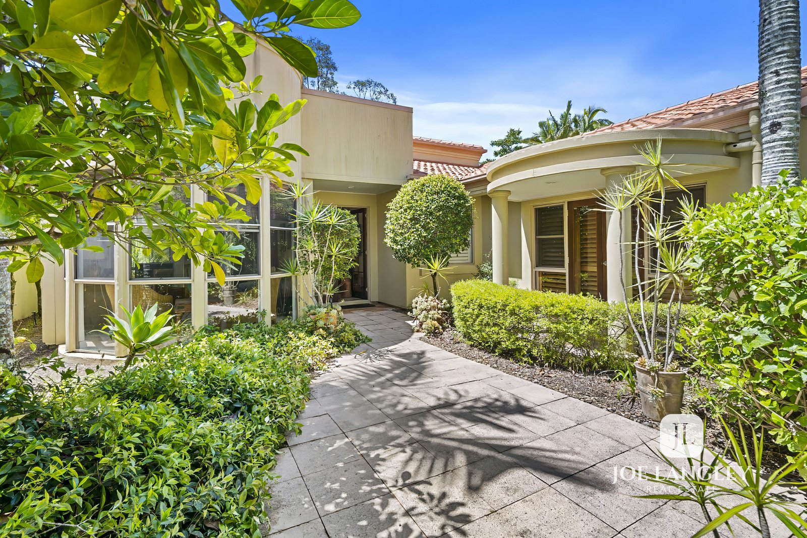 Beyond the gate and private courtyard, the tropical gardens lead you to the entrance of this impressive home. Step inside to discover spacious open-plan living with high ceilings, filling the home with natural light and creating an inviting sense of space.